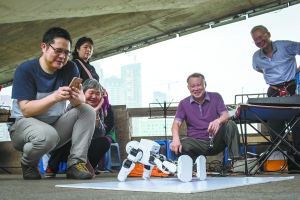 4月24日早晨9时许,广州市沙面公园,一个身高近50厘米的机器人正随着节奏热舞《江南style》。音乐响起,它的双眼变成深邃的深蓝色,扭头、后仰、摆手、踮脚,甚至还单手做俯卧撑,动作十分灵活,引来街坊纷纷驻足围观拍照(图①②)。