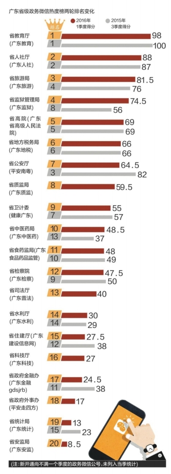 近年来,越来越多政务微信公号涌现,有的“接地气”,有的“很高冷”。什么样的政务微信公号,才是百姓所喜爱所需要的?南都指数从去年4月开始持续观察广东省级政务微信公号发展状况,今天继续推出广东省级政务微信公号热度指数排行榜,盘点第一季度广东各省级政务微信公号的表现。按照专家观点,政务微信公号应该更侧重于打造服务,如果服务做得足够好,可以带动内容的传播。常胜将军“广东教育”正是从提供查询高考成绩服务等便民措施做起。把服务做好后,让老百姓感到方便了,自然会来关注这个微信号,高阅读量和“爆款文章”,正是政务微信做好服务后所带来的良性反馈。