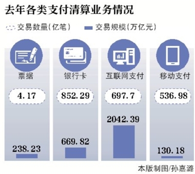 新京报讯(记者李蕾)中国支付清算协会5月19日发布《中国支付清算行业运行报告》,报告显示,2015年我国商业银行和支付机构处理的互联网支付业务金额共计2042.39万亿元。分析认为,支付业务持续由PC端向移动端迁移。