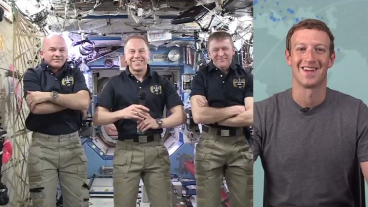 在海拔24 万米高空以7.7 公里/秒的轨道速度与扎克伯格以及全世界观众打招呼的,是蒂莫西·柯普拉(Timothy Kopra)、蒂莫西·皮克(Timothy Peake)和杰夫瑞·威廉姆斯(Jeffrey Williams),分别在上图的中间、右边和左边。