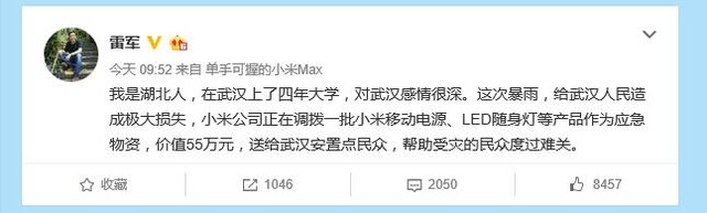 雷军微博称:“我是湖北人,在武汉上了四年大学,对武汉感情很深。这次暴雨,给武汉人民造成极大损失,小米公司正在调拨一批小米移动电源、LED随身灯等产品作为应急物资,价值55万元,送给武汉安置点民众,帮助受灾的民众度过难关。”