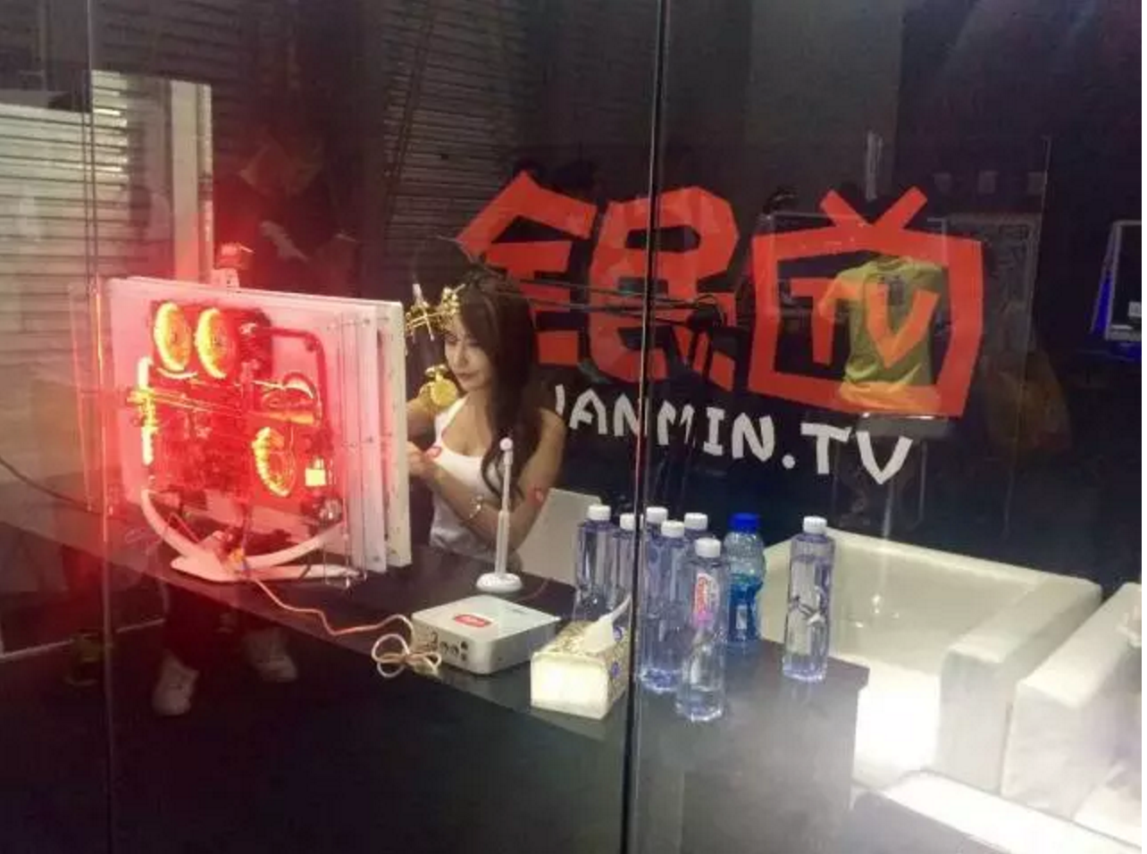 不过,心曼这样的ShowGirl对参观者的吸引力已经没有以前那么大,而作为新事物的女主播们受到了很多厂商青睐。全民TV在自己的展位上搭建了一个三面透明、背景一面贴着大大的“全民TV”字样的玻璃房。一位身穿白色裙子的女主播,正坐在装扮着红色LED灯的电脑屏幕前进行直播,一支金色的麦克风在女主播的面前熠熠生辉。与拍摄ShowGril时一样,摄影师们同样把镜头对准了房间里的女主播。