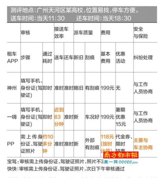 免费上门送取车究竟有啥困难,南都记者同一时间地点对神州租车、一嗨租车以及P P租车的这个环节进行实测(滴滴租车仅在上海试点,广州无法评测)了解其使用过程的不同。结果是送车环节一嗨后台交接出现延误,还车环节3个平台响应都准时迅速。