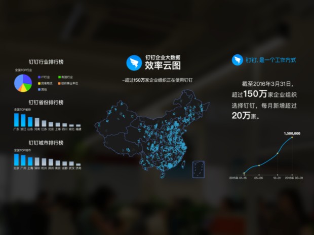 钉钉创始人陈航公布了钉钉的最新一组数据,截至2016年3月31日,阿里钉钉已覆盖150万家企业组织,月均增速接近20万家。其中不乏云锋基金、复星集团、优酷土豆、统一企业、汽车之家、分众传媒、海底捞等一流企业,自2015年1月正式发布以来,阿里巴巴钉钉只用1年时间就成长为中国市场的第一企业社交平台。