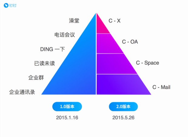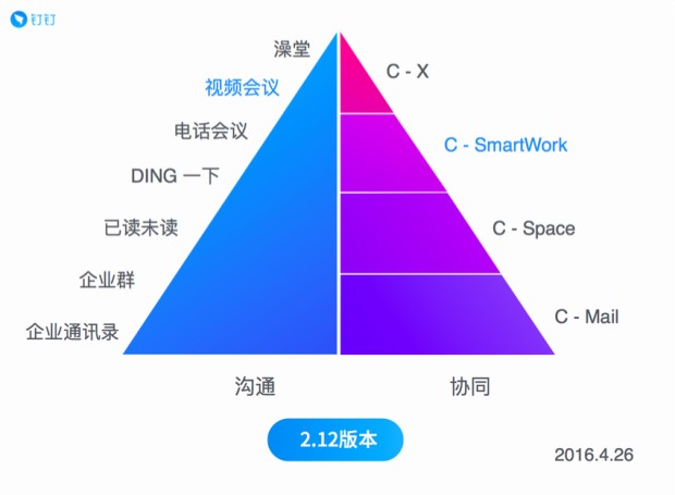 钉钉2.0版本发布,在统一通信能力的基础上,首次融入协同服务。同时提出C-X概念,让沟通和协同深层次地融合,包括C-mail,C-Space,C-OA功能。