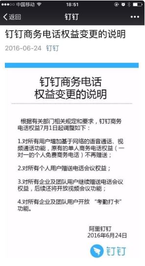 而就在刚刚,钉钉官方微信号发布了“关于商务电话权益变更的说明”,如下图所示: