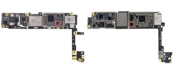 这是iPhone 7 逻辑板上的音频芯片和转接头上的芯片的对比图。不过这不是一个非常对等的对比,因为这些芯片中不仅只有数字模拟转换器和模拟数字转换器。比如那块比较大的芯片其实也是多媒体数字信号编解码器,其中应该是没有放大器的(因为iPhone 7 逻辑板其他位置上有三个放大器。所以放大器就不可能还放到这里面)。