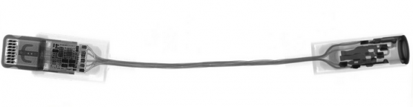 下面我们先来看看这个转接头的X射线图,图片来自Creative Electron。当然这个转接头的一头是3.5 毫米接头,另外一头则是Lightning 接头。3.5 毫米接头这边是没有什么值得我们探讨的东西,而Lightning 接头相比起来就要有意思多了,一个神秘的集成电路就把这一头的空间给占据的差不多了。