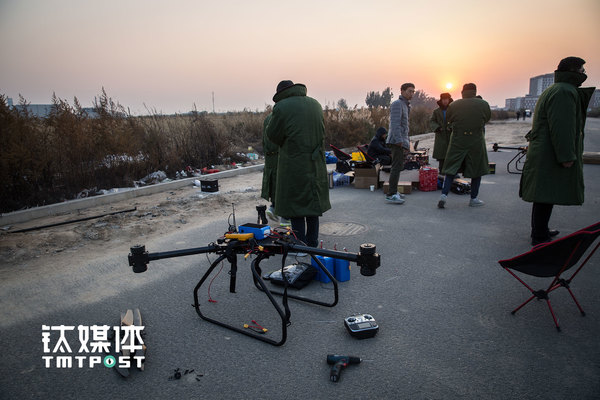 2016年11月1日,京东无人机外场试飞前,团队成员对飞机进行调试,此次试飞的机型将在今年“双十一”投入运营。今年6·18,京东在江苏宿迁试运营了无人机送货,是京东无人机首次亮相。