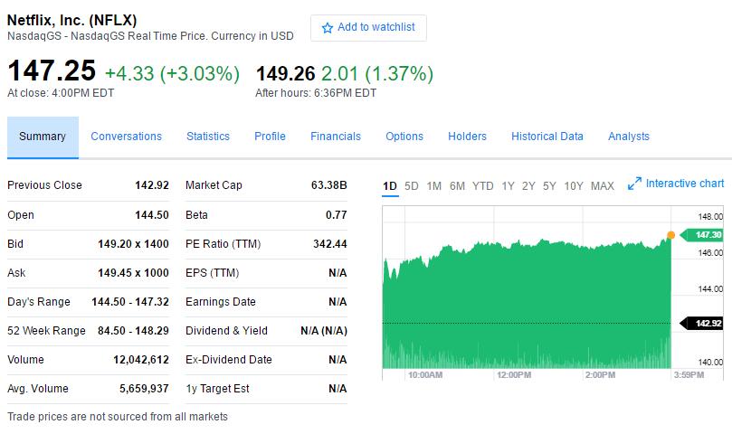 周一纳斯达克股市收盘,Netflix股价上涨4.33美元,收于147.25美元,涨幅为3.03%。在截至美东时间18:36(北京时间18日早6:36)的盘后交易中,Netflix股价上涨2.01美元,暂报149.26美元,涨幅为1.37%。过去52周Netflix股价最低为84.50美元,最高为148.29美元。(编译/扬帆)