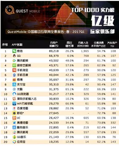 4月18日,专业数据分析机构QuestMobile正式发布《2017年移动互联网春季报告》(以下简称“报告”)。 “秒拍”以2.76亿月覆盖用户数位列整个移动端视频应用的第4位,位列短视频行业第1名。此外,秒拍也凭此位列中国移动APP排行第14名。