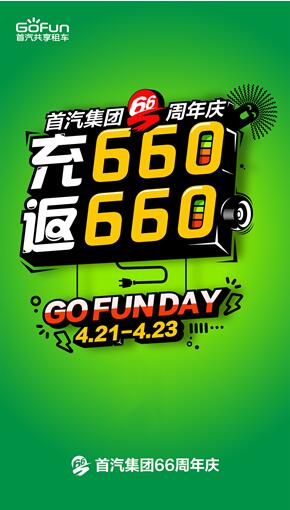 4月21日,首汽旗下新能源分时租车品牌Gofun出行宣布,为庆祝4月23日首汽集团成立66周年,4月21日、22日、23日连续三天开启“Gofun Day 66周年特别版”活动,用户通过Gofun出行APP充值660元后,账户将获得1320元,每位用户最多可参与2次。