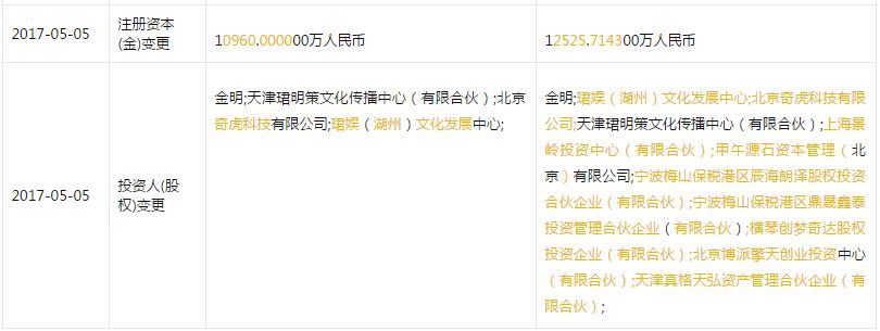 凤凰科技讯(作者/朱旭冬)5月12日消息,熊猫TV主体公司上海熊猫互娱文化有限公司的于近日变更了工商注册信息,新增了多位投资人,包括上海景领投资、甲午源资本管理、宁波梅山保税港区海朗泽、宁波梅山保税港区鼎晟鑫泰、横琴创梦奇达、北京博派擎天创业投资中心、天津真格等。