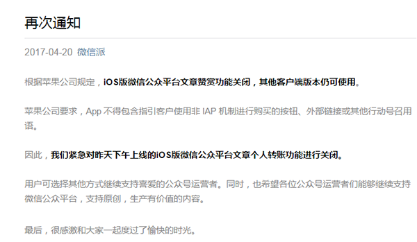 早前一段时间,苹果根据最新制定的App Store 规则条例,已经封禁了腾讯公司旗下微信公众号的打赏功能。本来以为这件事情会以双方继续冷战而中场休息,可是从近来苹果的举动来看,似乎苹果是想要更大的蛋糕。