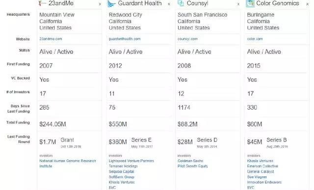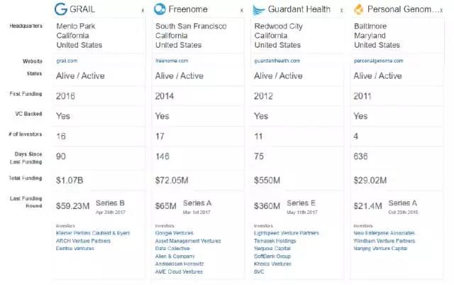 在企业投资机构中,最活跃的是基因检测设备制造商,例如Illumina,或是大型制药企业,例如罗氏(Roche),还有一些科技公司,例如Google,GE等,都对该领域很感兴趣。