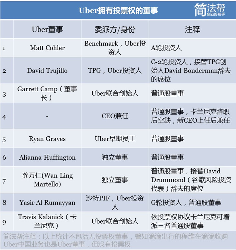 在上表中,根据Uber公司2016年投票权协议统计的董事人选与Uber董事会发给公司全体员工发出的邮件中的签名吻合,卡兰尼克辞职后空缺的CEO专属的董事席位应该会在Khosrowshahi上任后兼任。