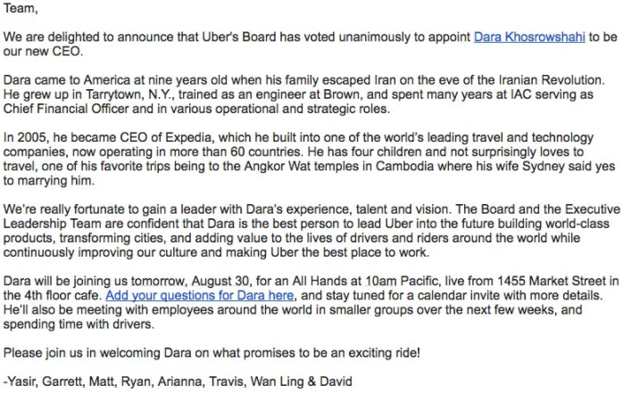 员工见面会的前一天,Uber董事会向公司全体员工发出的邮件宣布任命Khosrowshahi为公司新CEO,明确董事会是全票一致通过了这位新CEO的任命。