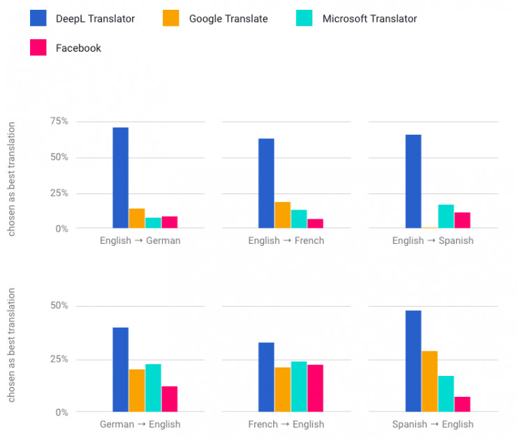 DeepL 邀请了职业翻译者,对 DeepL 翻译、谷歌翻译、微软翻译以及 Facebook 的 NMT 系统进行了盲测,要求测试者选出所认为的最好的翻译结果。测试语言为三组,分别是英德、英法、英西互译,样本为 100 个句子。DeepL 并未公布每组参与测试的职业译者数量。测试结果如下: