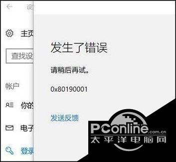 【PConline资讯】Win10添加pin码报错“0x80190001”如何解决? 最近一位用户在Win10系统下添加pin码,结果跳出提示“发生了错误 请稍后重试。0x80190001”,后来用户想使用Windows反馈中心进行反馈,但是反馈中心也无法打开,这是怎么回事呢?这种情况一般是由于网络不便引起的,下面我们来看看具体的修复方法。