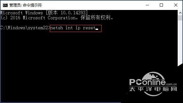 2、在命令提示符框中输入:netsh int ip reset 按下回车键;