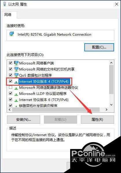 6、选中 internet 协议版本4(TCP/IPv4),点击【属性】;
