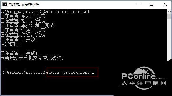 3、接着输入:netsh winsock reset 命令按下回车键尝试重置网络,重置完成后记得重启计算机,重启后查看是否可以正常设置,若问题依旧继续往下看;