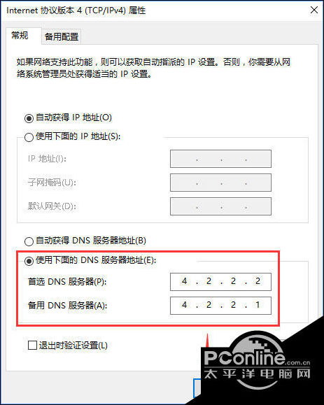 7、点击 使用下面的 DNS 服务器地址,将DNS服务器手动设置为”4 2 2 2“和”4 2 2 1“,单击确定 -- 确定。