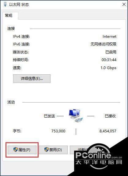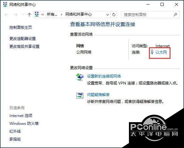 5、在打开的网络共享中心点击 当前使用连接的网络,无线的话选择wlan当前连接的wifi名,有线的选择以太网,在弹出的状态界面点击 属性;