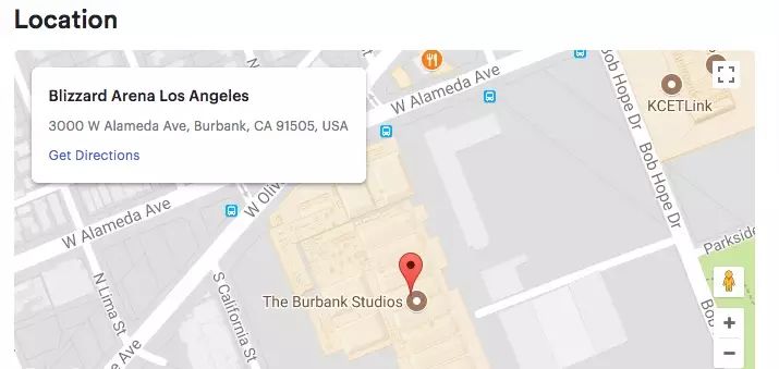 该场馆被命名为 Blizzard Arena Los Angeles,位于加州的伯班克市,这里原本是一个演播室,被暴雪改造后,将成为暴雪粉丝们的团聚之地。据暴雪的介绍,这里可以容纳 450 个观众,并具有专门的解说室,还有选手的训练室、休息室和办公室。