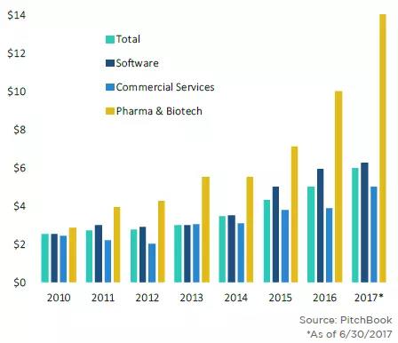 从行业来看,商业服务行业的天使和种子轮的估值较2016年增长了40%,是增长最多的行业。其他行业的持续估值增长绝大部分可以归因于软件和生物技术行业的大额交易,包括DNA诊断技术平台Biomeme的1150万美元的种子轮融资。