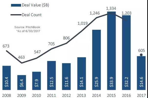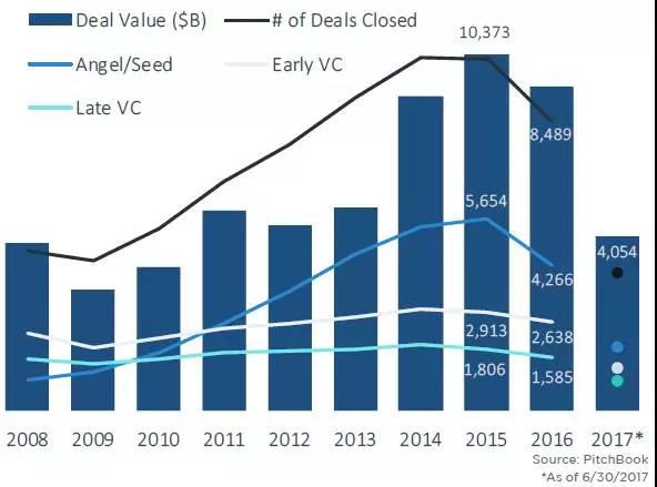 虽然自2014年以来,风险投资大量寻求早期阶段的公司(A轮-B轮),但到2017年上半年,早期阶段的交易量一直保持稳定,没有很大的变化。