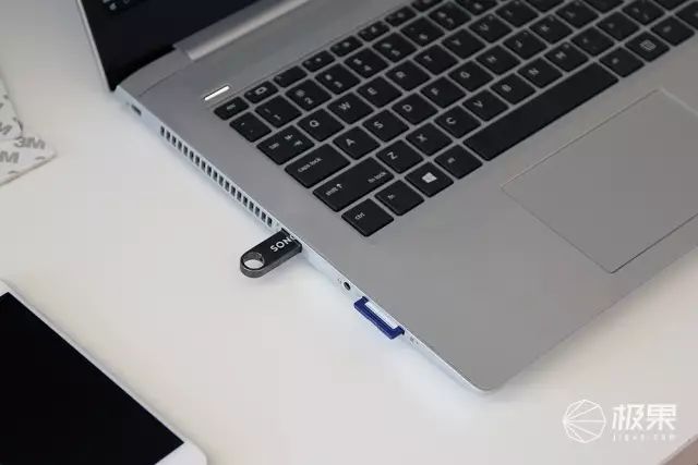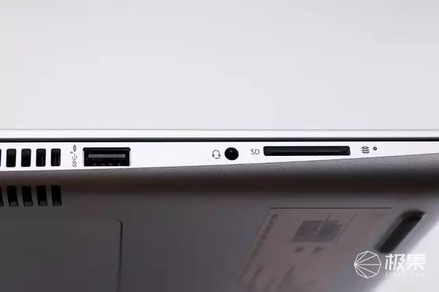 再来看看各个接口细节,作为一款笔记本,尤其商用本,读卡器使用率确实还是挺高的。尤其对于一些经常需要处理照片的用户,有一个SD读卡器,那真是方便太多了。旁边的耳机麦克二合一接口和USB则是标准配置了。