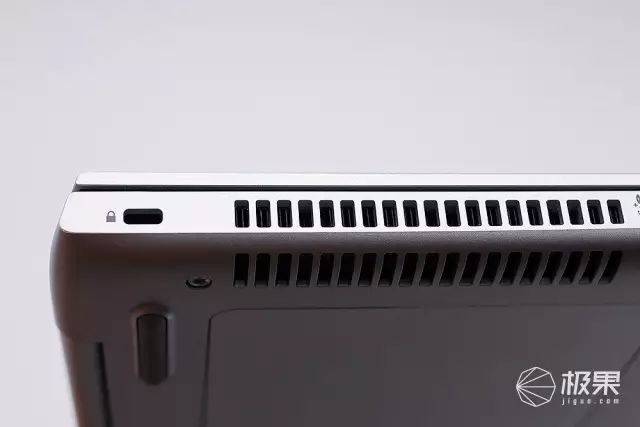 防盗锁扣孔也是必不可少,旁边的则是散热出风口了。出风口设计在左侧是明智之举,因为如果在右侧,有时候吹出的热风,很可能会吹着你那拿着鼠标的手。