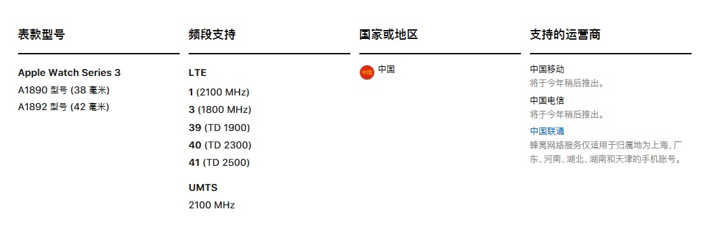 而苹果公司也投桃报李,在其官方公布的国行版Apple Watch Series 3所支持的网络频段中,除了三大运营商现有的Band 1、Band3、Band39、Band40、Band41通行的LTE频段外,还特别支持UMTS 2100MHz,就是考虑了中国联通的4G网络不具备VoLTE功能、 语音由WCDMA 2.1G频段承载的客观情况。