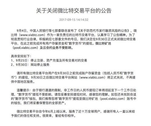 对此,微比特今天下午发布公告称,作为一家负责任的比特币交易平台,认真学习了公告精神。为了彻底贯彻行业自律,积极响应七部委文件的号召,我们决定在9月30日正式关闭微比特交易平台,在此之前完成所有用户存留资金和“数字货币”的提现,微比特矿池(pool.viabtc.com)及云合约业务不受影响。