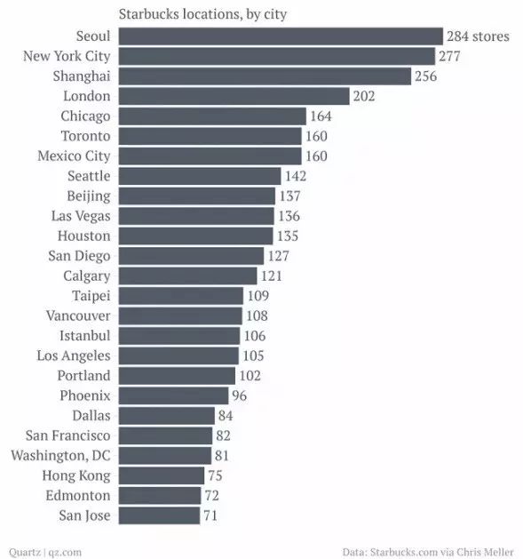 但令人惊讶的是,世界星巴克门店最多的城市竟然不是纽约(277家)而是首尔(284家)!(求粉丝大神解惑)