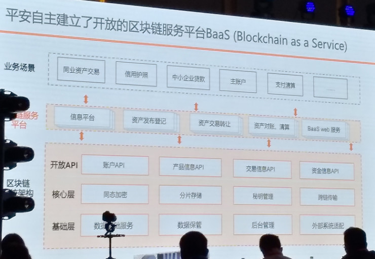 在系统架构上是第二层服务平台。该平台是连接平安业务场景的桥梁,该层能够实现信息存储、资产发布登记、资产交易转让、资产对账清算,以及BaaS web服务。