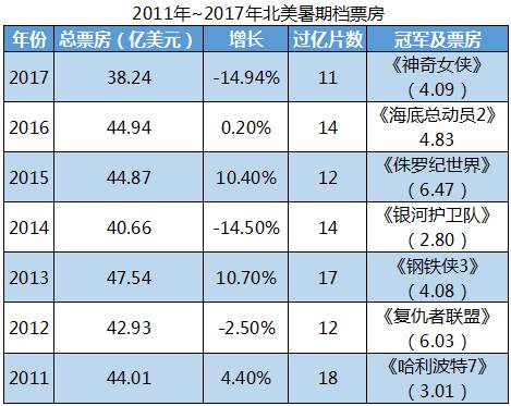 (1)从票房上来看,今年年北美整个暑期档票房38.24亿美元,而2016年44.94亿美元,比去年少6.7亿美元;