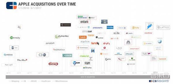 除了芯片之外,从2010年至今,苹果已经陆续收购了四五十家创企,包括语音识别、图像/面部识别、计算机视觉、AR、数据挖掘、机器学习、地图、定位等等,而这其中几个比较具备代表性的有: