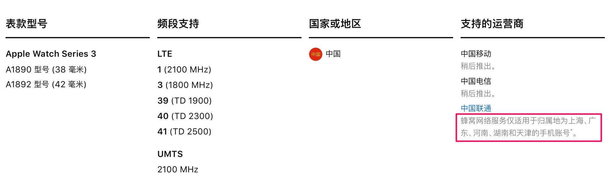 由于 LTE 频段不同,海外购买的 Apple Watch 无法在大陆使用蜂窝网络 中国联通的 SIM 卡可以率先使用上这一服务。不过,目前只支持归属地上海、广东、河南、湖南和天津的卡号。
