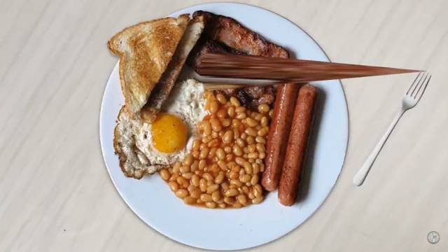 不知道作者和英式早餐有什么仇什么怨,在《正宗英式早餐(Full English Breakfast)》里,面对着一盘食物的玩家拿起刀叉,却不能叉起食物,而只能对其进行……没错,涂抹。最终,在一顿乱画之后,好端端的早餐就变成了看不出原样的魔性画面。