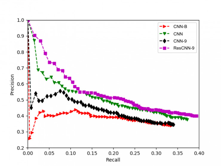 但我们却发现,使用 9 层卷积神经网络 (CNN-9) 的效果,并没有单层 (CNN) 的好。这个结果跟过往的经验违背。我们猜测原因是,在 distant supervision 的数据裡面,有太多错误标签的数据,这些数据带来太多的噪声,而这些噪声随著越深层的神经网络而被放大,导致 9 层卷积神经网络 (CNN-9) 的结果比单层 (CNN) 更差。为了解决这个问题,我们使用残差网络,来帮助网络的特征学习。