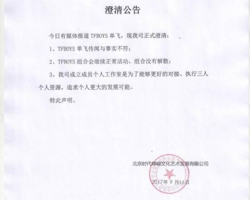当日下午,针对网络上“TFboys组合单飞”的报道,组合所属的北京时代峰峻文化发表声明澄清,1.单飞传闻与事实不符;2.TFboys组合会继续正常活动,组合没有解散;3.成立成员工作室是为了能够更好地对接、执行三人个人资源,追求个人更大的发展可能。