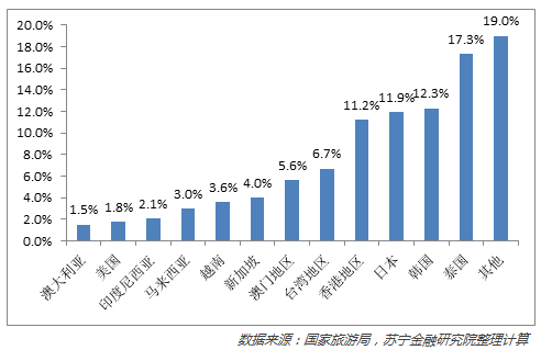 我们从2016年境外游数据看,泰国、韩国、日本、中国香港、中国台湾、中国澳门、新加坡、越南、马来西亚、印度尼西亚、美国和澳大利亚依次是国人最爱的旅游目的地(参见下图)。