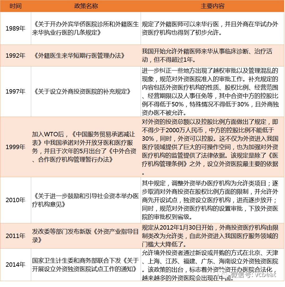 中国最早的有关医疗行业市场准入的法律文件,出现在1989年,规定了外籍医师可以来华行医,并且外商在华试办外资医疗机构也得到了初步允许。