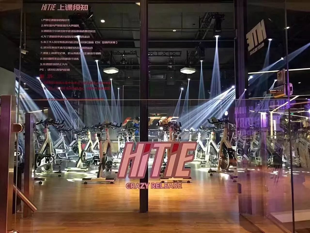 嗨铁的单车室由一块半圆形的玻璃墙隔开,正中间是DJ和教练,灯光音响设计都是夜店风格。整体面积3000平,4个月投资1500万元改造完成。