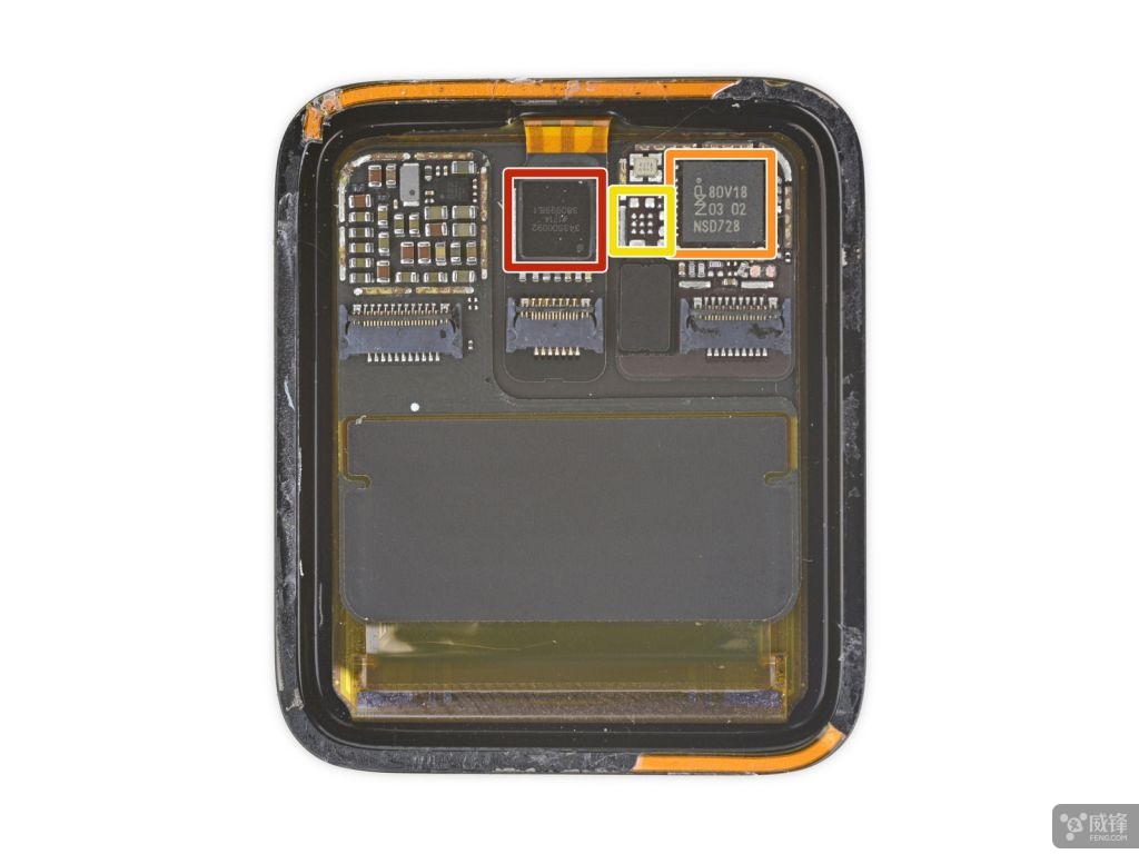 红色:意法半导体 ST33G1M2 32 位单片机,配备 ARM SecurCore SC300 微处理器(这应该是 Apple Watch 的嵌入式 SIM 卡)
