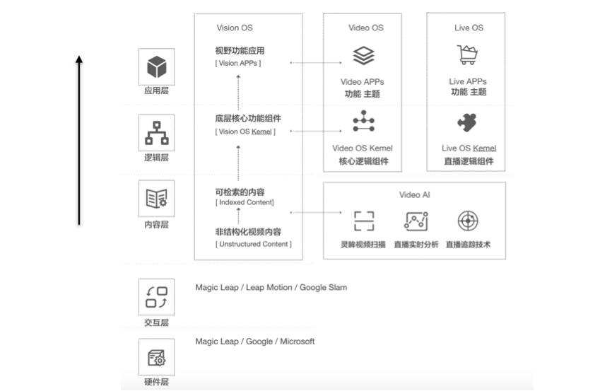 而这些视频内的广告类型还可以做灵活组合与运行,其靠的是一个特别的轻量级视频操作系统。一般的操作系统有四层,硬件层、交互层,然后到逻辑层、应用层,视频操作系统在交互层后多了一个内容层。在内容层上,首先要通过人工智能技术把视频中的人脸、物体等非结构化数据结构化,分析出人物、地点、品牌、动作等等不同的维度。接着是逻辑层,通过不同的组件,比如说直播、点播等等,组成相关的应用。最后到顶层,应用层,这一层有不同的功能和主题,以及互动应用。
