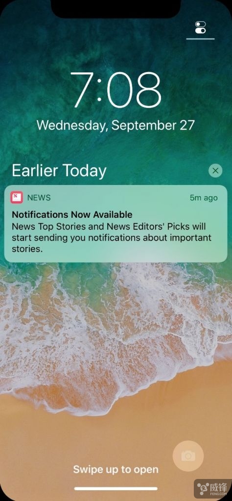 锁屏上有更多的组件需要注意,其中包括一些在苹果 9 月份的发布会中没有提及的细节。首先,锁屏界面上标志性的提示文字现在变成了“向上滑动打开”。取消 Home 键之后,用户可以通过屏幕底部的细条进行解锁和与 iPhone X 互动。