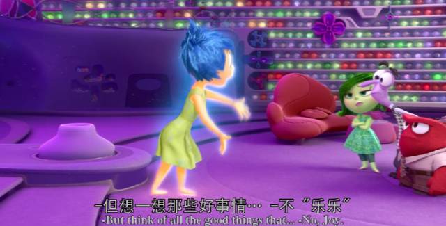 一定要让主人公的记忆必须全都是快乐的。还经常“欺负”其他情绪,每次出现快乐以外的记忆球时,她就很不爽,尤其是对代表悲伤的Sadness。